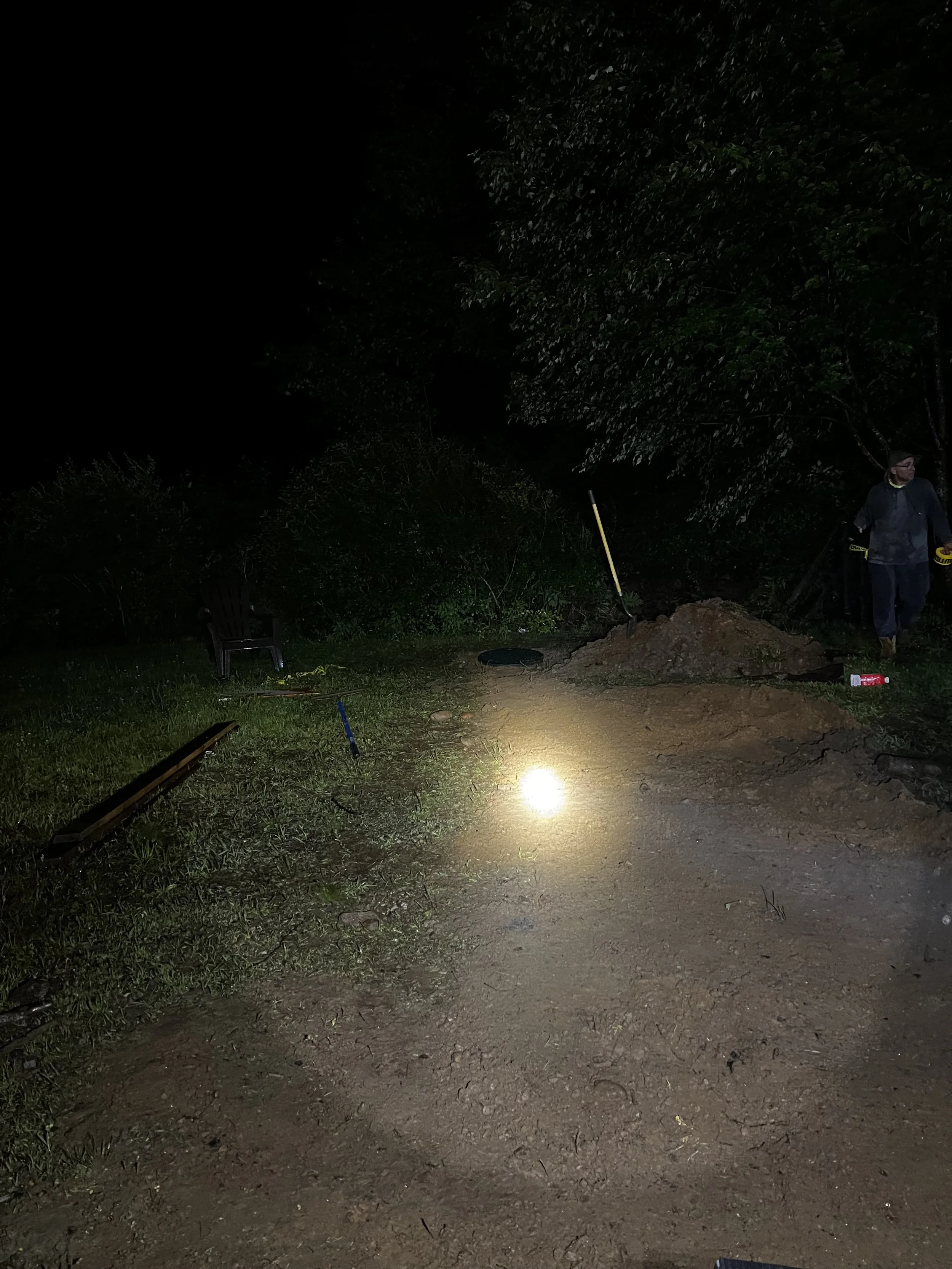 Some photos became corrupted; what isn't pictured is the 4“ HDPE landscaping pipe running from the groundwater basin near the foundation to the distribution cistern at the end of the trench. The distribution cistern is bottomless, hole-sawed with approximately 40-50 holes, and wrapped in landscape cloth in order to attempt to stop the entry of sediment into the cistern. The surrounding area was then filled in with 3/4” crushed stone all around and beneath it, about 3-4 to divert water evenly through the all around the surrounding area. Crush stone was also added to the cistern itself, as crushed stone is an excellent medium for water to travel through.
